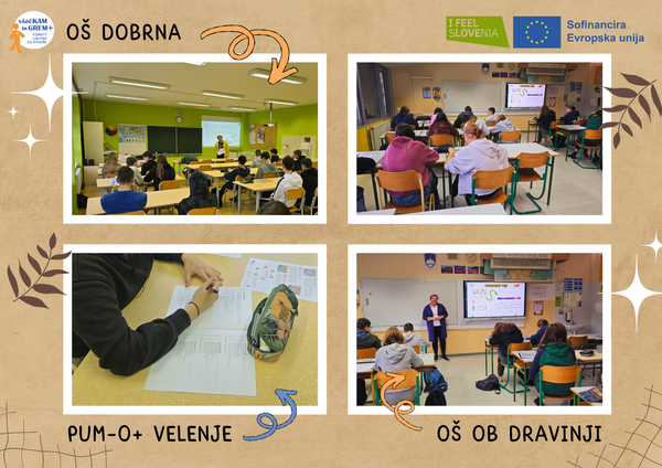 V Velenju smo z mladimi v programu PUM-O+ poglabljali razumevanje njihovih interesov skozi poklicno testiranje in Hollandov model, kar jim je pomagalo jasneje začrtati svoje nadaljnje korake. Na OŠ Dobrna so učenci spoznavali poklice prihodnosti ter različne možnosti štipendiranja, ki lahko pomembno vplivajo na njihove izobraževalne poti.