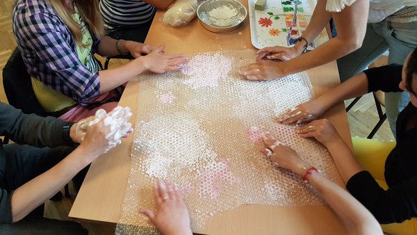 Za delo smo potrebovali neobdelano volno za polstenje, milo v kosu, posodo z vodo, ustrezno podlago z grobo površino ter seveda veliko dobre volje in kanček ustvarjalnosti. Glede na časovno omejenost smo izdelali le manjše izdelke, a zagotovo ne zadnje.