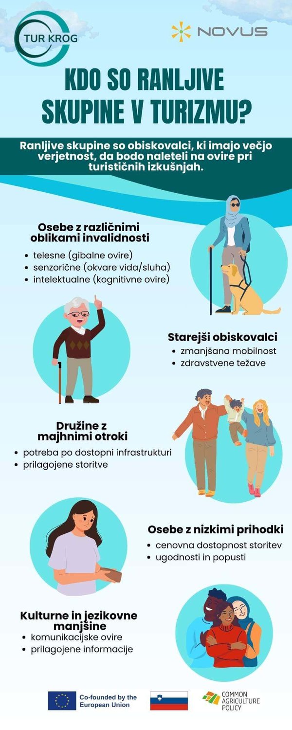 Turizem bi moral biti dostopen vsem, vendar se določene skupine obiskovalcev pri načrtovanju svojih potovanj še vedno soočajo s številnimi ovirami. Infografika projekta TUR KROG izpostavlja ključne skupine, ki v turizmu potrebujejo posebno pozornost in prilagoditve.
